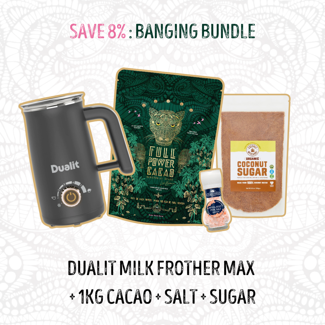 Add your Cacao to a pan with a small amount of your water or plant milk, whisk into a paste and then add the rest of your ingredients. Heat but don’t allow to boil. Serve and connect!! FULL POWER!