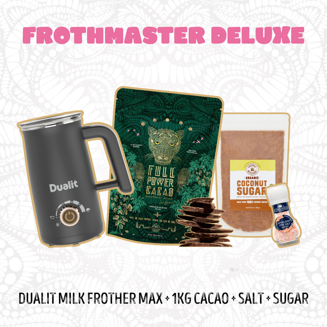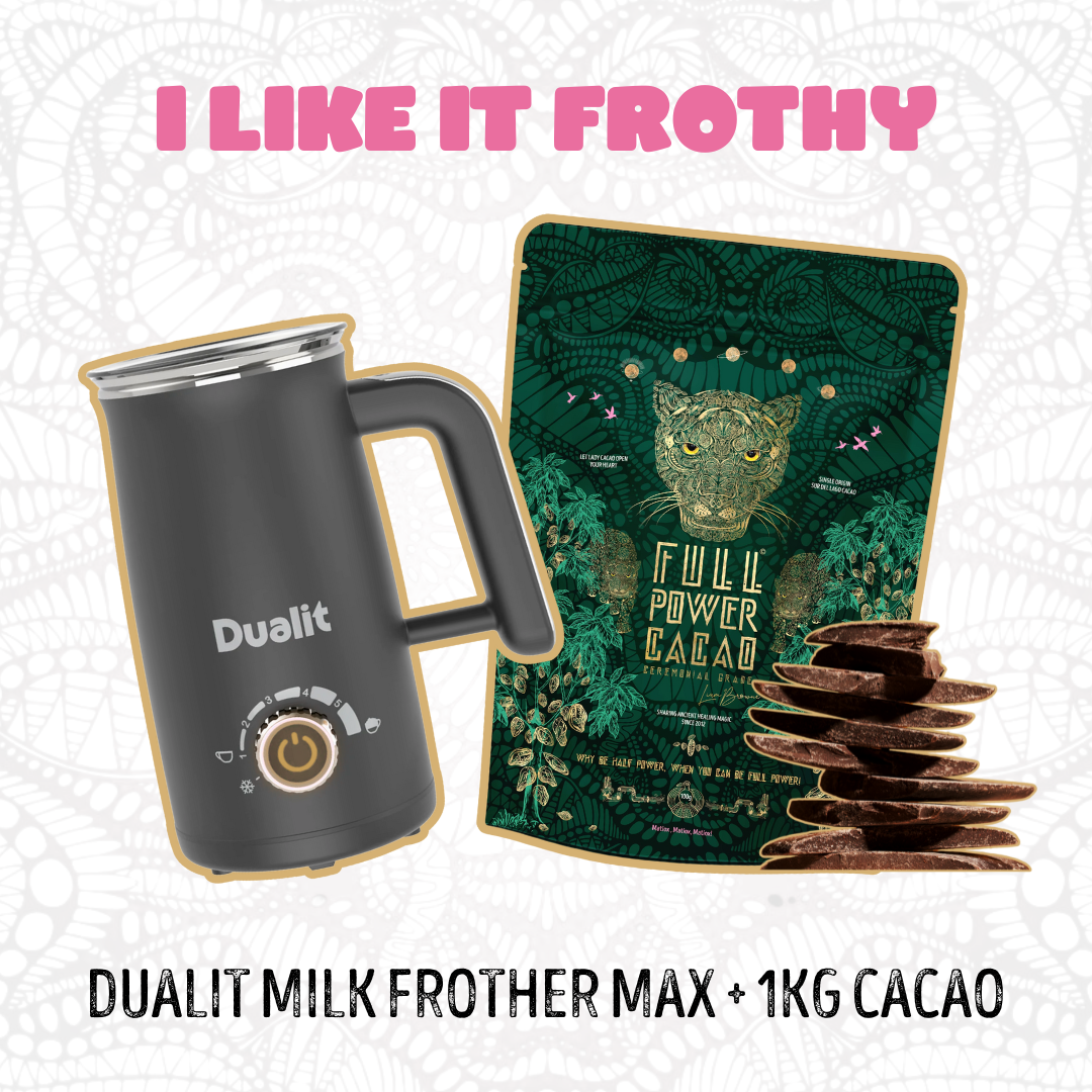 Add your Cacao to a pan with a small amount of your water or plant milk, whisk into a paste and then add the rest of your ingredients. Heat but don’t allow to boil. Serve and connect!! FULL POWER!