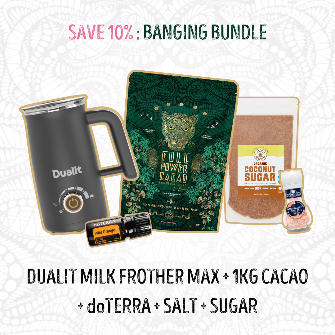 The Dualit Milk Frother Max makes silky, café-smooth ceremonial cacao in minutes — no mess, no noise, no supervision. Just pour your base, add your cacao flakes, salt and sweetener, press go, and the vortex does the rest.