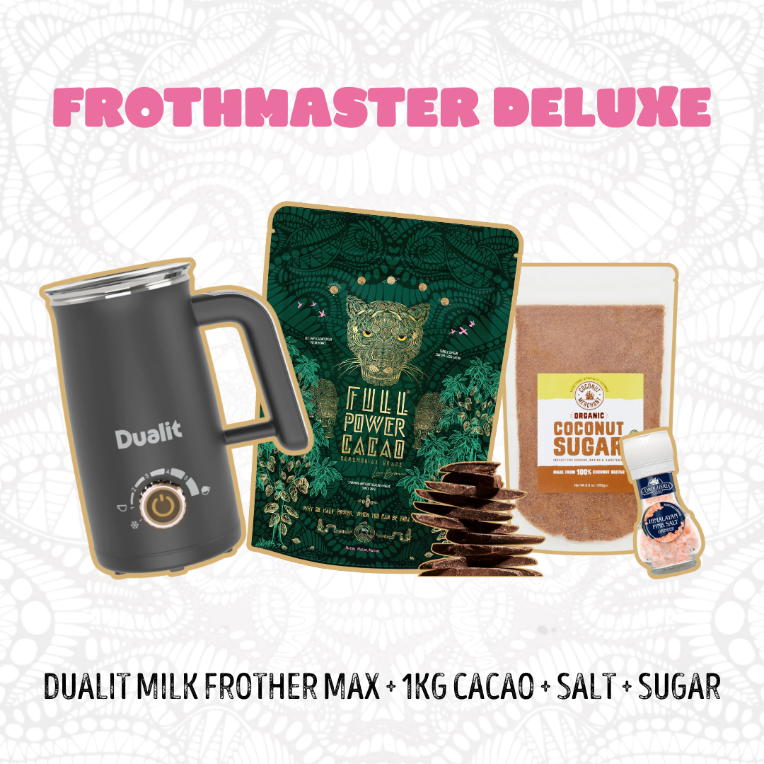 The Dualit Milk Frother Max makes silky, café-smooth ceremonial cacao in minutes — no mess, no noise, no supervision. Just pour your base, add your cacao chunks, salt and sweetener, press go, and the vortex does the rest.
